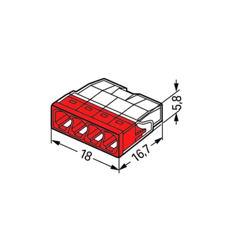 Met een afmeting van 18 x 16.7 x 5.8 mm neemt de Wago lasklem 4 voudig weinig ruimte in beslag, waardoor hij perfect geschikt is voor montage in verdeeldozen en schakelkasten. Ondanks zijn compacte formaat kan deze lasklem draden van 0.2 tot 2.5 mm² moeiteloos en veilig aansluiten.