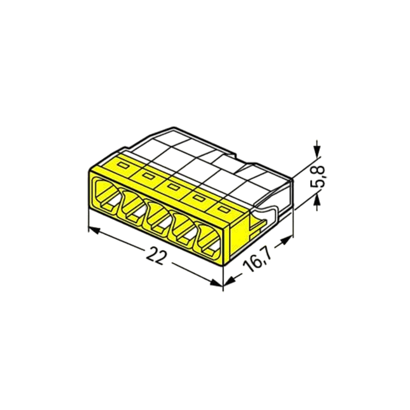 Met een afmeting van 22 x 16.7 x 5.8 mm biedt de Wago lasklem 5 voudig een slimme en ruimtebesparende oplossing voor verdeeldozen en schakelkasten. Ondanks het compacte formaat levert de lasklem uitstekende prestaties en is hij geschikt voor draden met een diameter van 0.2 tot 2.5 mm².
